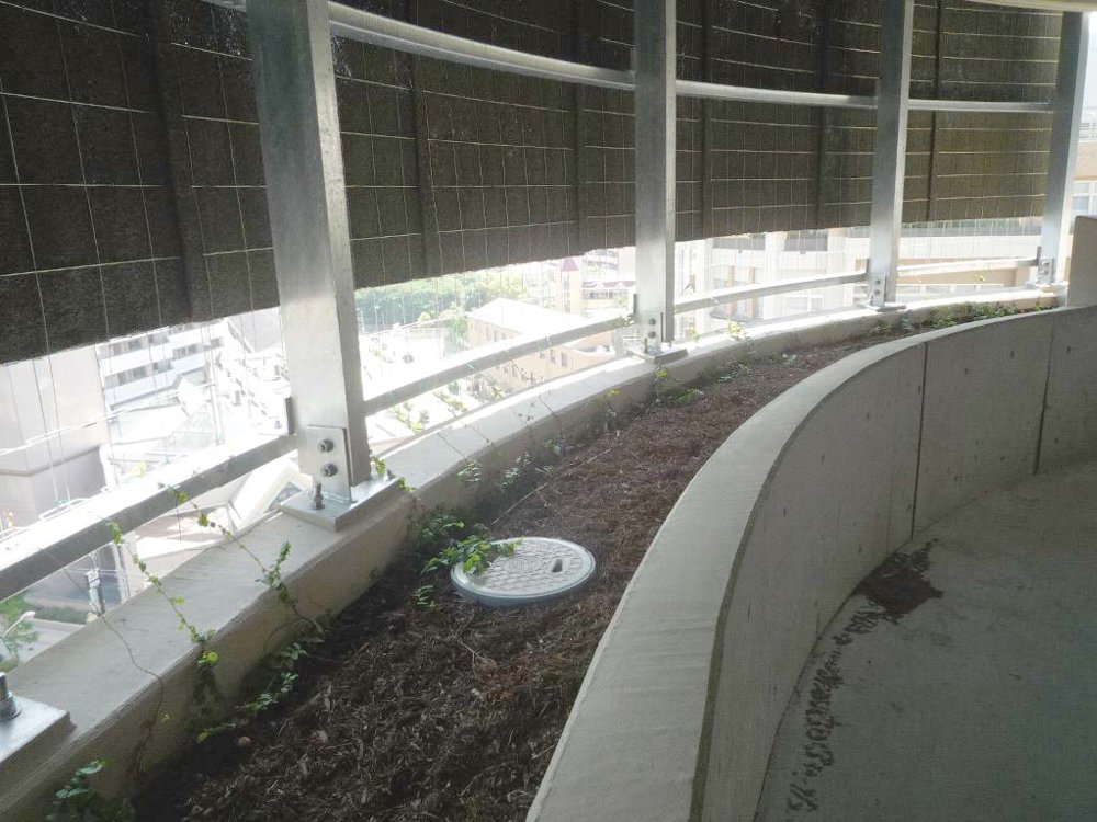 市街地にある自走式立体駐車場の一部を緑化。