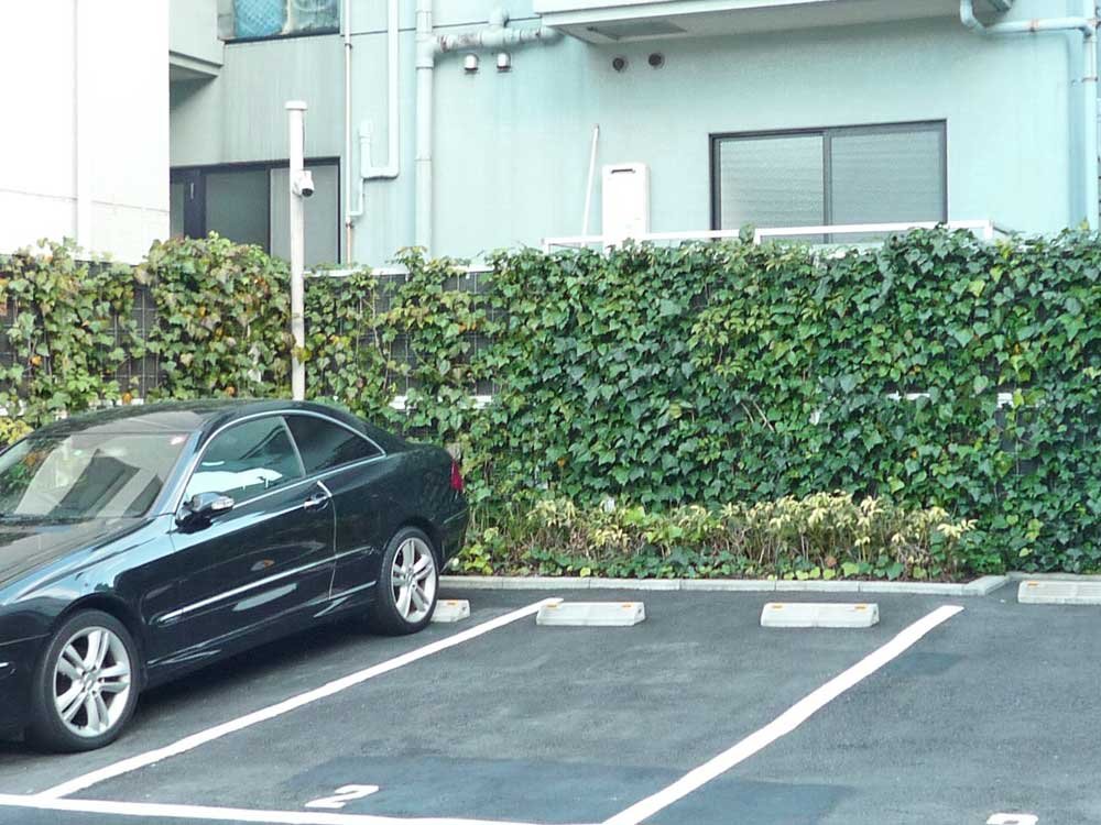 隣接する住宅および景観に配慮し、道路に接する駐車場の背面を緑化。